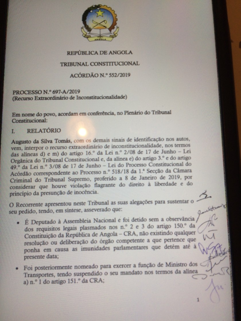 Leia até ao fim o Acórdão N.552/2019 do Tribunal Constitucional de Angola, sobre o Caso do Sr. Augusto da Silva Tomás, ex-ministro dos transportes de Angola.