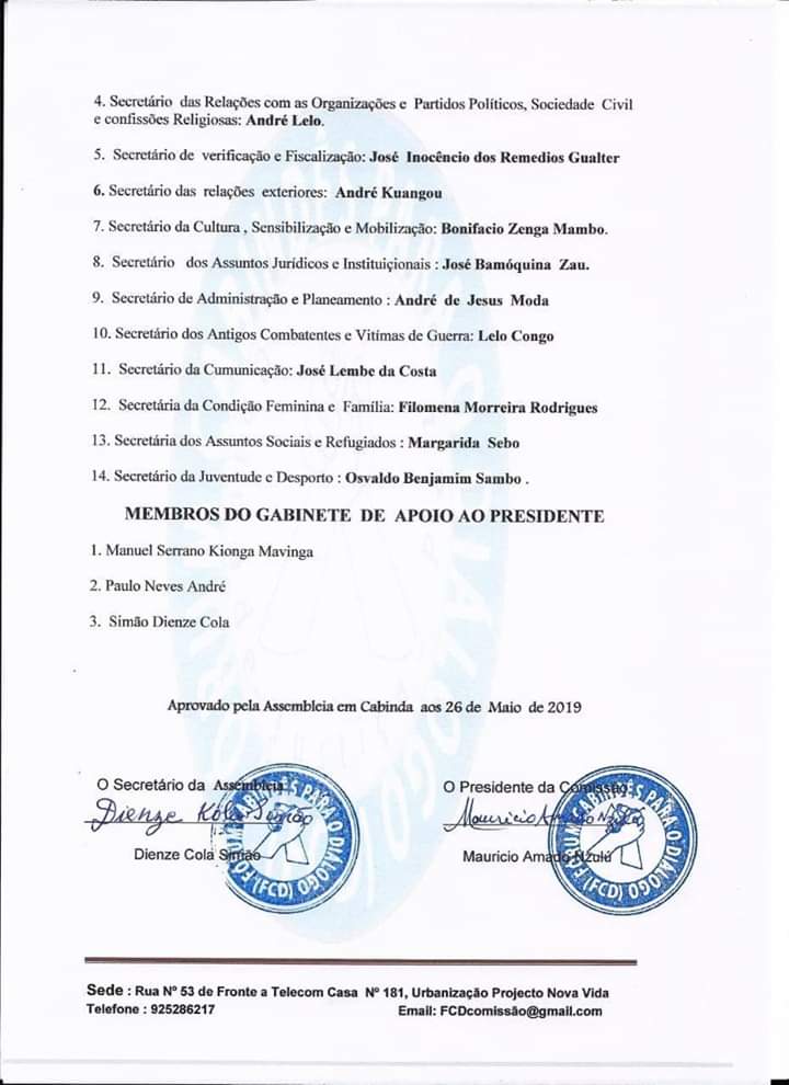 “Em anexo a lista nominal dos Lacaios do MPLA, membros do FCD, com a missão de enganar uma vez mais o povo de Cabinda, em troca de acomodações políticas no governo angolano”.