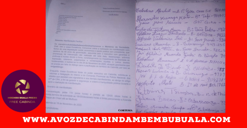 Manifestação em Cabinda para sábado 28/11/2020 já é uma realidade, embora com muita ginástica mas conseguimos entregar por via electrónica através do e-mail do governo provincial, agora ficaram nos dever o protocolo.