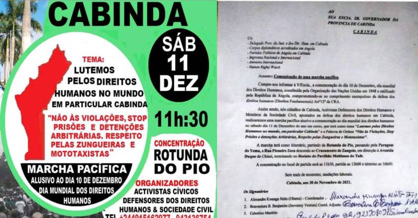 Promovem uma Manifestação Pacífica no sábado dia 11 de Dezembro do ano em curso, que terá como tema “Lutemos pelos Direitos Humanos no mundo, em particular Cabinda” e com a Palavra de Ordem “Não às Violações, Stop Prisões e detenções Arbitrárias, Respeito pelas Zungueiras e Mototaxistas”.